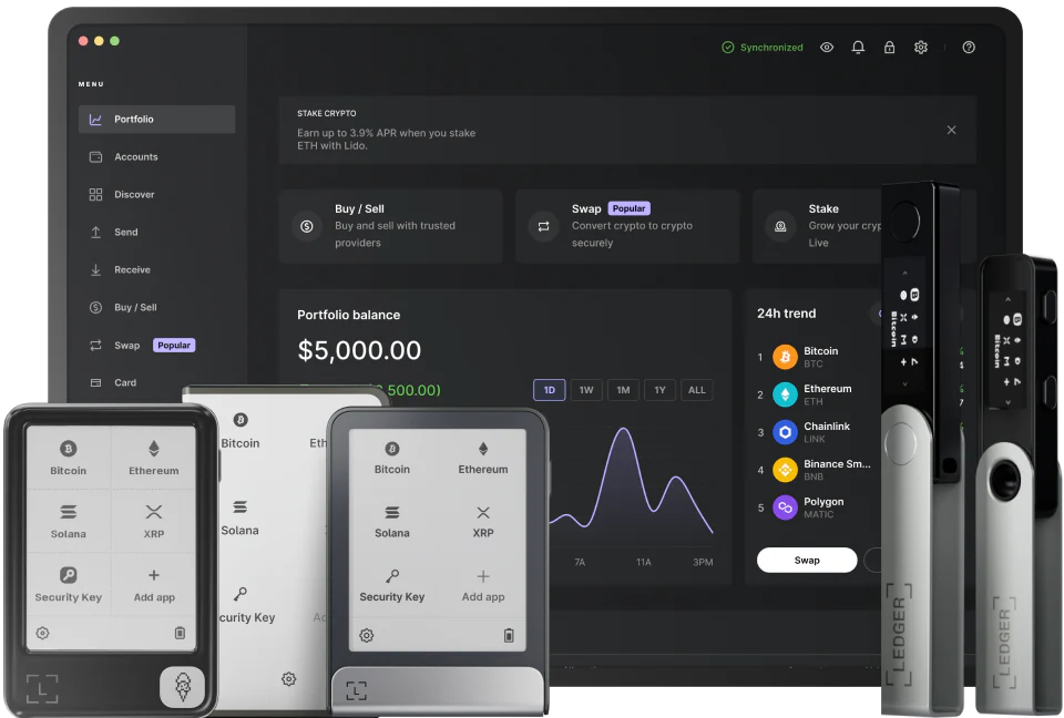 Ledger offers secure hardware wallets to protect and manage cryptocurrencies and NFTs, allowing users to buy, swap, stake, and manage over 5,500 digital assets.
